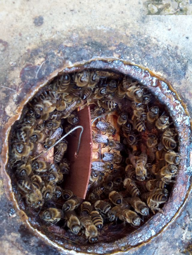 - Kolem 10. srpna jsem do všech včelstev vložil gabonové pásky na letní léčení proti varroáze, které jednoduše vsunu mezi plásty do úlu přes otvory určené pro krmení sklenicemi, viz foto.